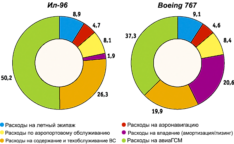 - Zelený sektor představuje náklady na palivo. Hlavní výhodou dvoumotorového letadla je menší spotřeba paliva. Dva motory s velkým tahem spotřebují méně paliva než čtyři menší. Podle statistik Aeroflotu byla hodinová spotřeba paliva u letadel IL-96 -300 7977 kg a Boeing B-767 potřeboval na hodinu letu pouze 4979 kg, což bylo o 37,6 % méně. Náklady na palivo představovaly pro IL-96 více než polovinu nákladů na jednu letovou hodinu (50,2 %). Zde je rozdíl mezi oběma letadla značný.